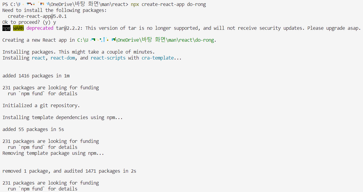 do-rong 부분은 본인이 설정하고 싶은 패키지 이름으로 하면 되고, y를 입력해 패키지를 다운받아 준다.