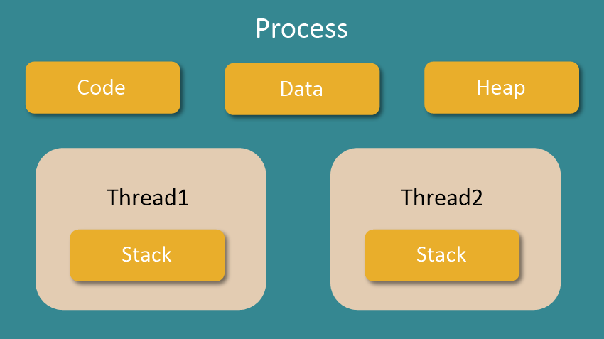 Code, Data, Heap 영역을 공유하고 있으며, Stack에서만 스레드를 별로 가진다.