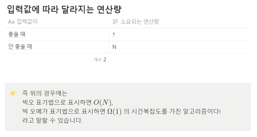 빅오메가 표기법은 최선의 성능이 나올 때 어느 정도의 연산량이 걸릴 것인지를 구하고 표기법으로 표시하면 Ω(1)이다.